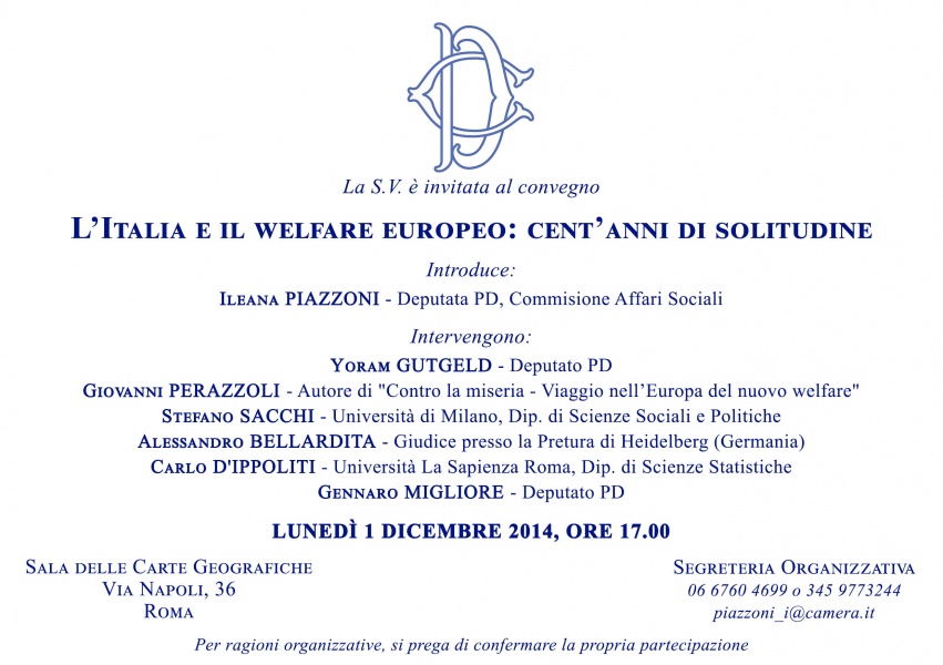 Vogliamo provare a far comprendere la profonda distanza tra il nostro sistema di welfare e quello di gran parte dei Paesi europei, un sistema capace di garantire indipendenza e autonomia nel corso della vita intera, oltre che protezione nella malattia e nella vecchiaia. I dati dimostrano che questi sistemi di welfare non solo non sono in crisi, ma al contrario sono da sempre il miglior antidoto al clientelismo, alla corruzione e quindi all'accumulo di debito pubblico. Il convegno vedrà la partecipazione e gli interventi dei deputati del Pd Yoram Gutgeld e Gennaro Migliore, dei professori Stefano Sacchi del Dipartimento di Scienze Politiche dell’Università di Milano e Carlo D’Ippoliti del Dipartimento di Statistica dell’Università la Sapienza di Roma, nonché di Alessandro Bellardita, giudice della Pretura di Heidelberg (Germania). Sarà inoltre presente Giovanni Perazzoli, autore del libro Contro la miseria – Viaggio nell’Europa del nuovo welfare.